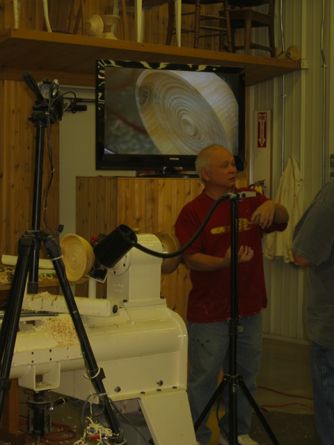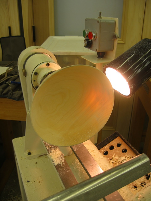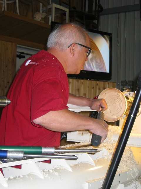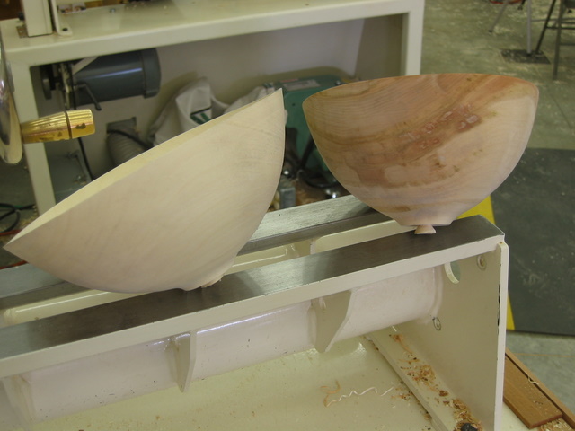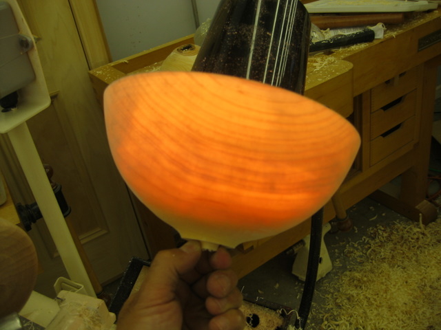 I turned two bowls. One Maple and one Cherry. The darkness of the cherry made it more difficult to turn to thin even wall thickness because the light did not show through the walls as readily as with the Maple. In the pictures you can see my Maple bowl in various stages of completion.