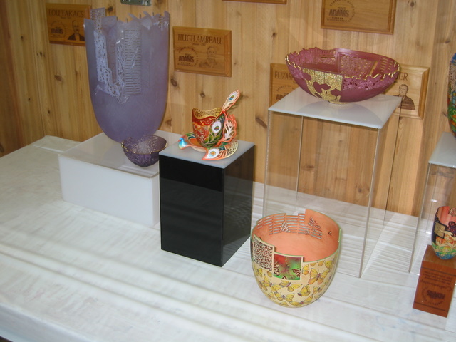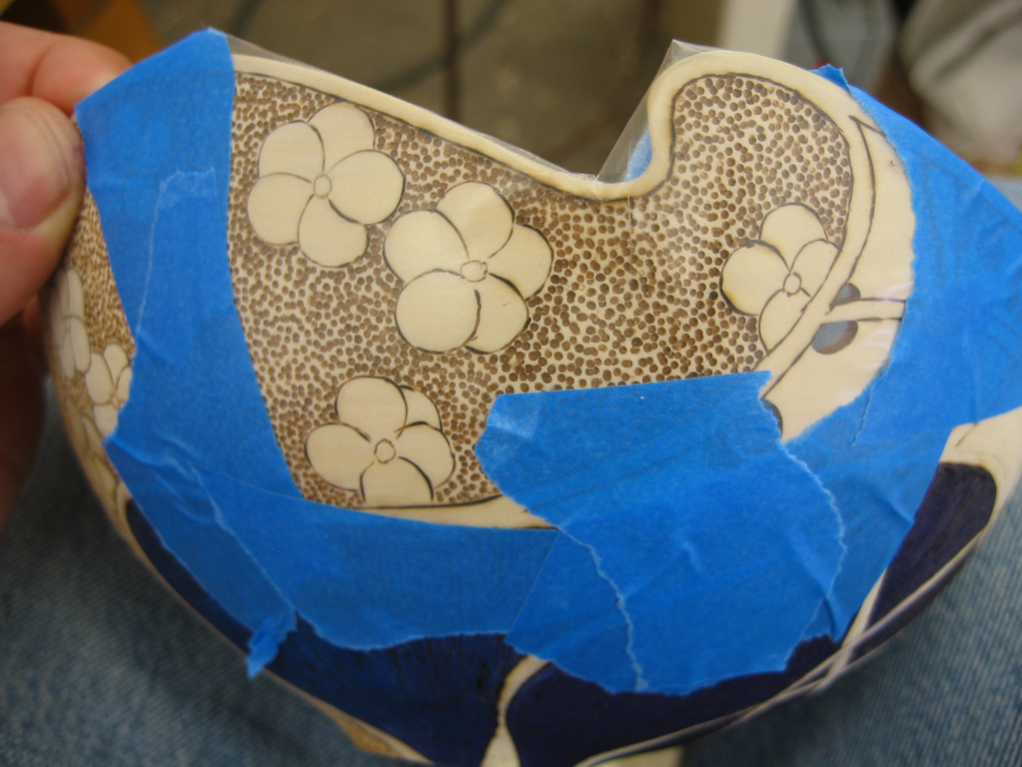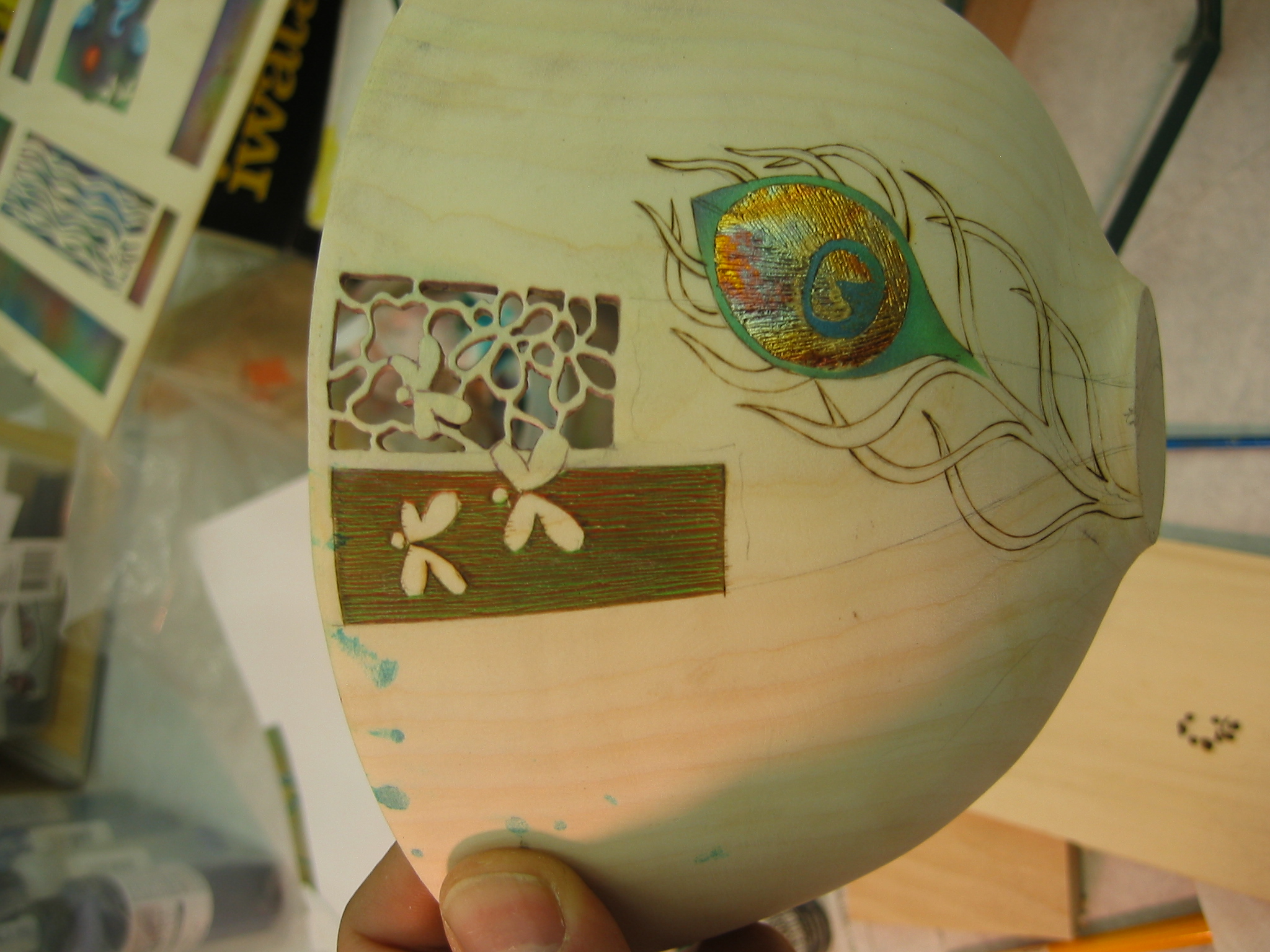 In the pictures you can see the demo panel that Binh did during the class as well as a demo bowl that he did to show techniques on a round rather than flat surface. The lower portion of the bowl is a peacock feather that is gold-leaf gilded in the center - a characteristic element of many of Binh’s designs.