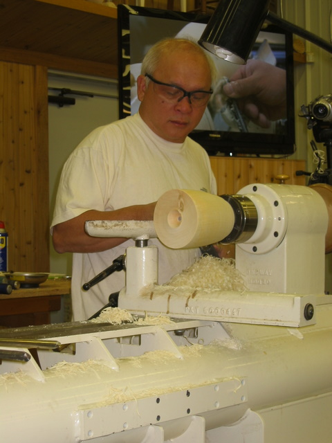 I had left off after day one - when we did thin-walled turning of face-grain-oriented bowl forms. Day two started with a demo by Binh turning a taller end-grain-oriented hollow vessel. The techniques here are very similar to those for turning a thin bowl. However, since you are turning end-grain some different tools are used and the light used trick to measure thickness looses a bit of its effectiveness due to the depth of the vessel and amount of chips limiting your view as you turn. Binh has a way around this that I’ll discuss later.