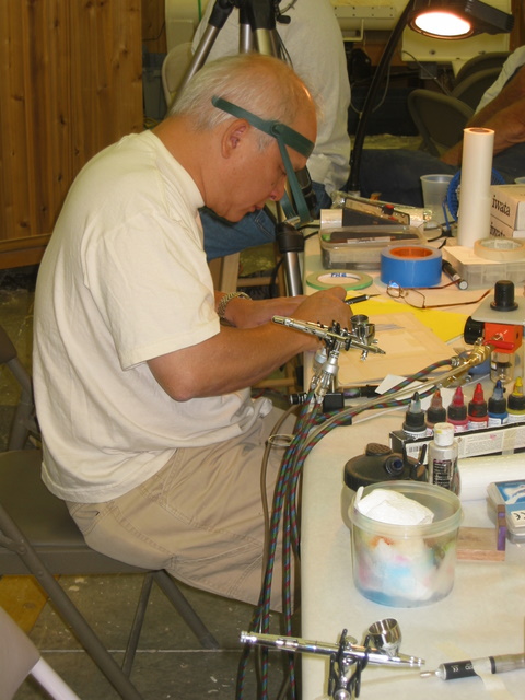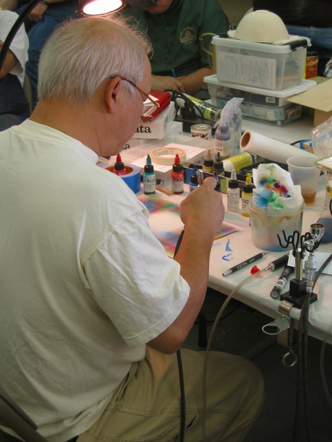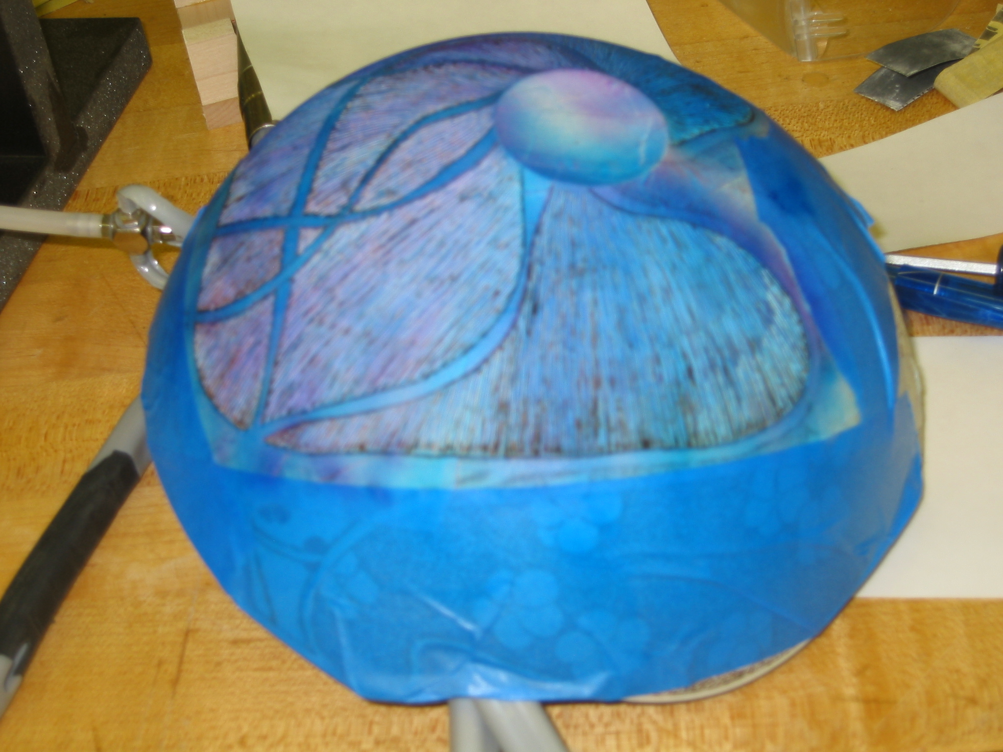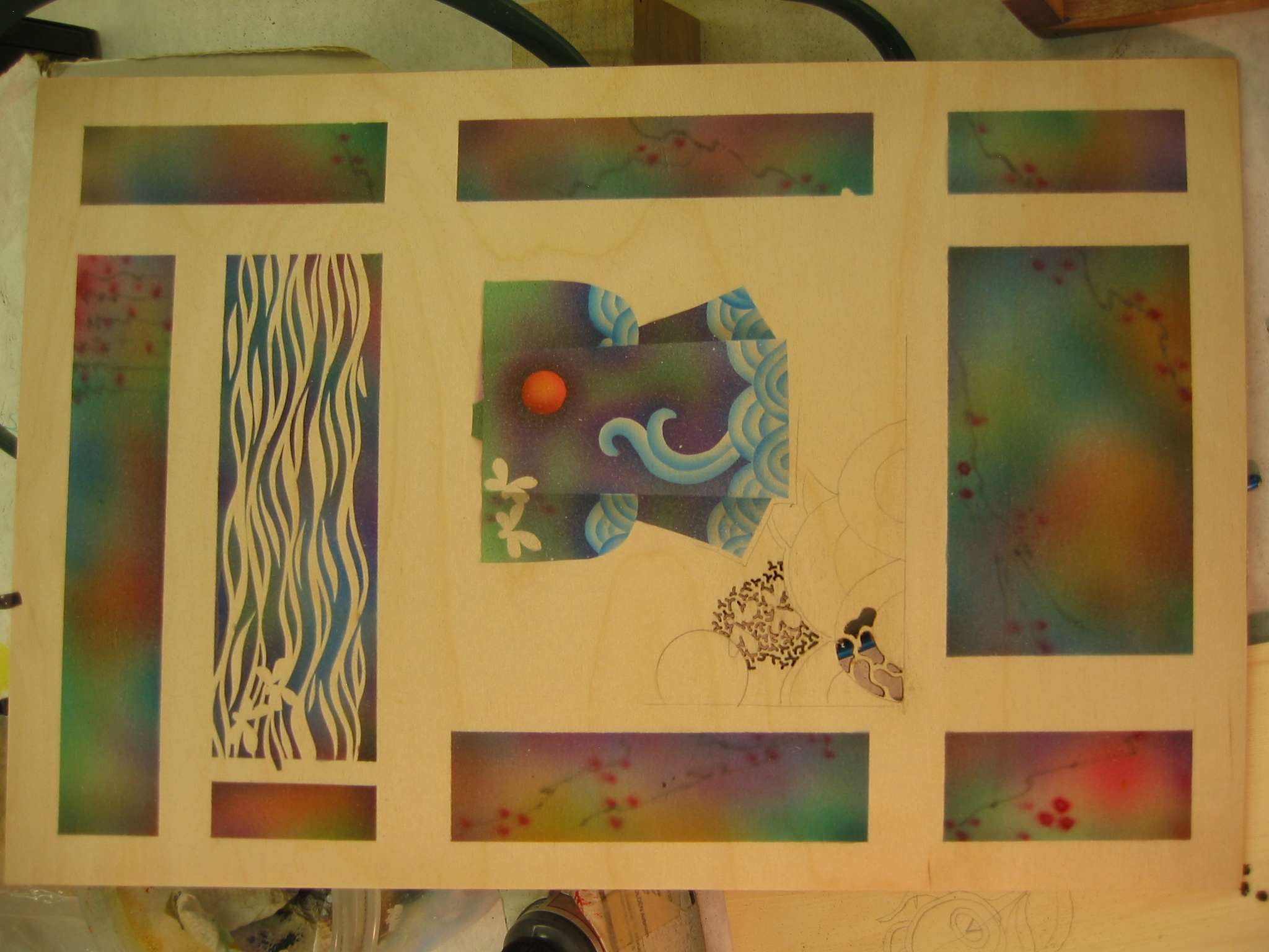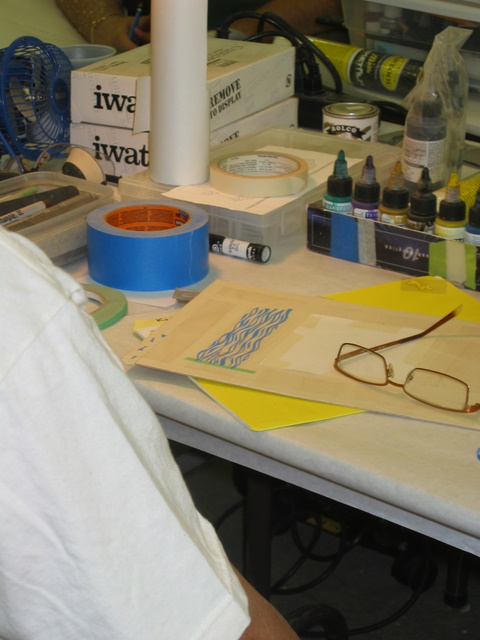 There is a lot of masking and/or template shielding done for an airbrush design. Things like masking tape and a clear tacky matt material called Frisket are used. Every element of a design that requires a different color and/or treatment must be cut out with an X-acto knife and removed one at a time as paint is sprayed on. Since we used transparent colors, darker colors are sprayed first and then lighter colors are added on top. Needless to say, it is a time consuming process.