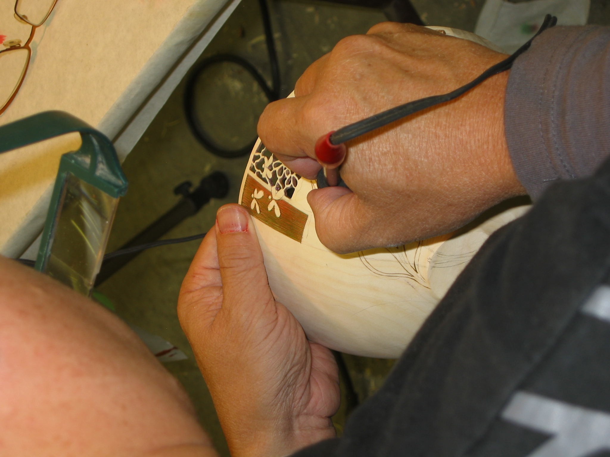 Binh often burns a thin outline around each element that he is going to airbrush or pierce. This is done with a standard wood burning pen with a fine skew tip and minimal heat. The desire is to just burn a faint line to define that part of the design. Once the entire piece id designed and burned, then the painting and then piercing can begin.