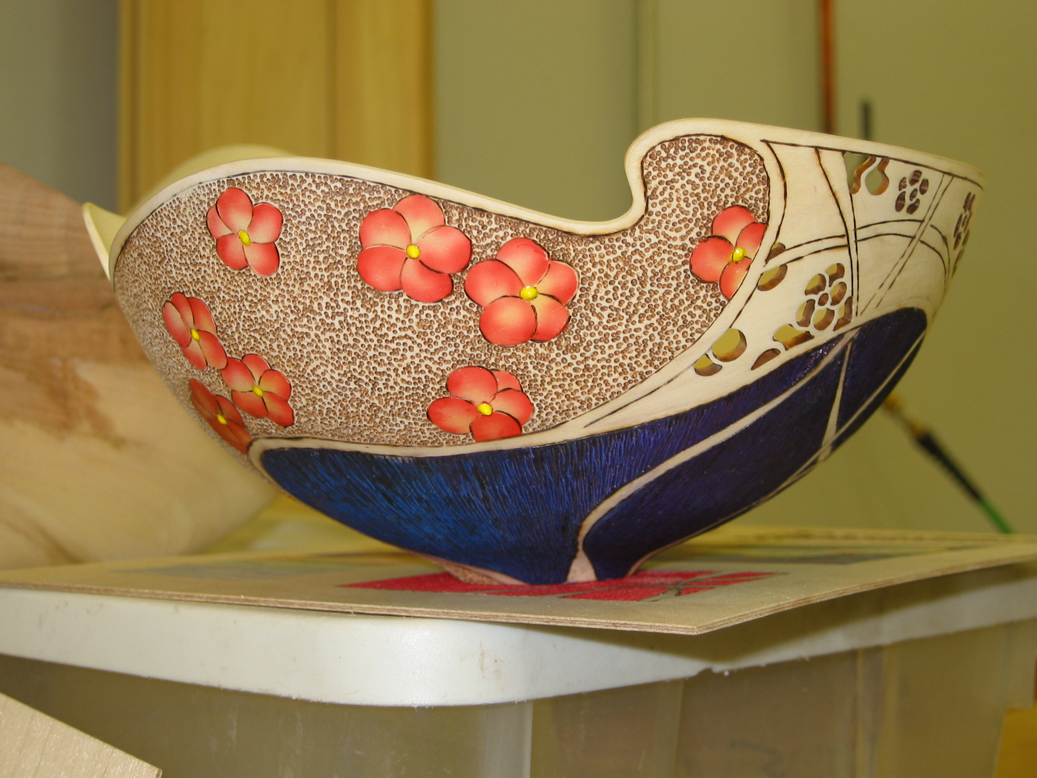 Piercing is done last to keep the most integrity in the vessel or bowl while it is being handled for painting. This is done with an air-powered dental NSK Presto tool that is actually used for dentistry - in fact the only difference between this tool and a dentists drill (which can also be used to pierce) is the form factor. The NSK Presto is held like a pencil to allow you to almost draw on the wood. The tool uses 1/16″ burs to pierce and/or carve the wood. In addition to piercing through the wood the round-head burs can be used for various stippled effects on the surface.