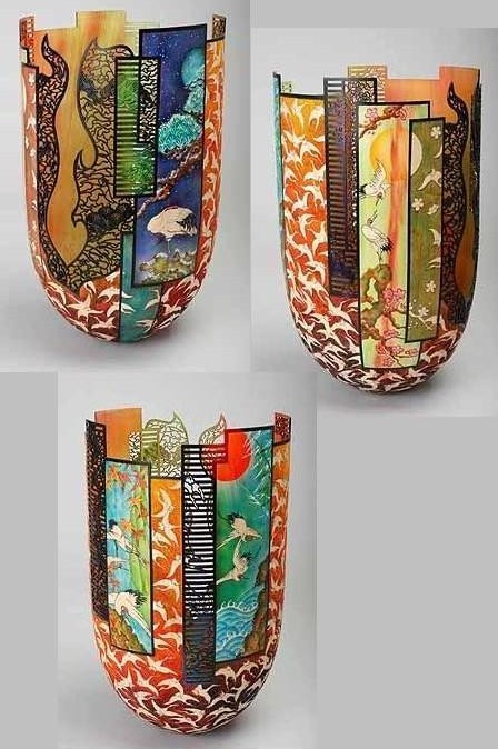 Binh’s work is characterized by very thin walls into which he pierces and and airbrushes designs. The objects that he creates transcend beyond functional turned items into true works of art. Binh uses all of his life experiences to influence how he embellishes his work with each piece telling a story. The pictures of a few of his pieces that you see here are taken from his web site.