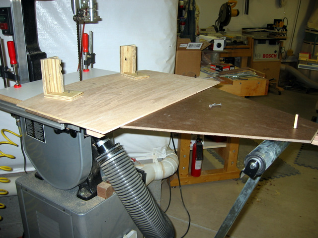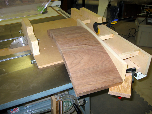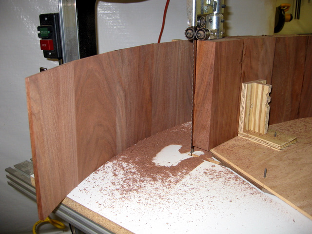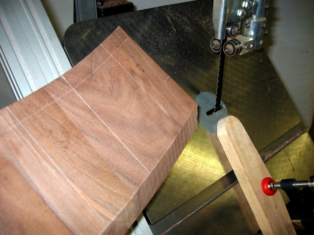 The jig is actually a very useful one for cutting circles and/or arcs at the band saw. You can see from the pictures that the jig consists of a base with a movable arm that holds a dowel pivot point. In addition, for this task of cutting an arc along the front and rear faces of the headstock there is also a temporary carrier board with some scrap L-shaped supports to hold the piece while cutting.