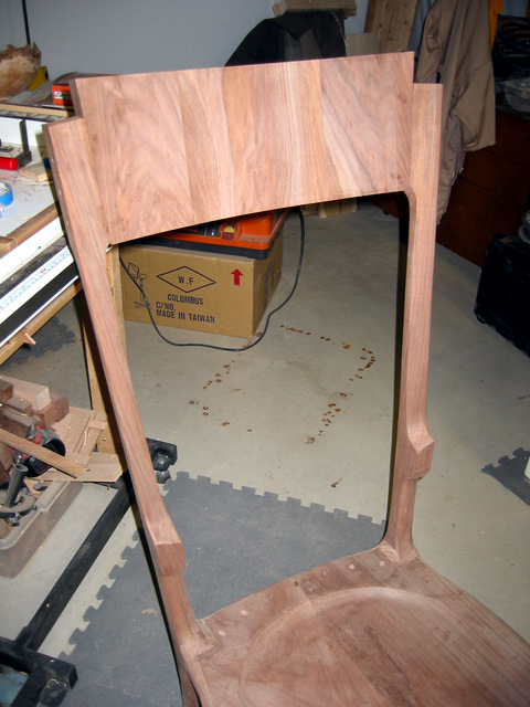 In the final picture you can see the headstock after some rough shaping with the angle grinder and random orbit sander. The headstock is not yet glued to the chair – it’s just held in place temporarily with screws. Once all of the back brace processing is competed the headstock can be glued to the chair.